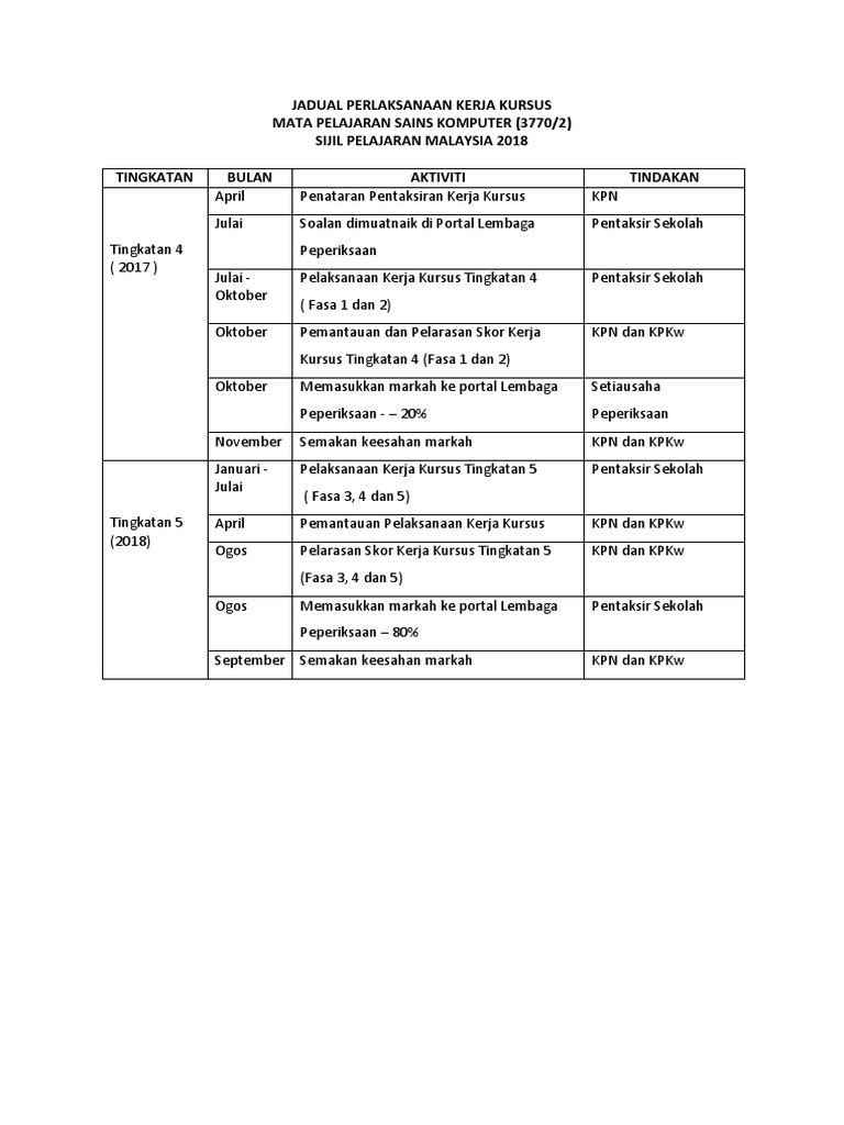 Jadual Perlaksanaan Kerja Kursus