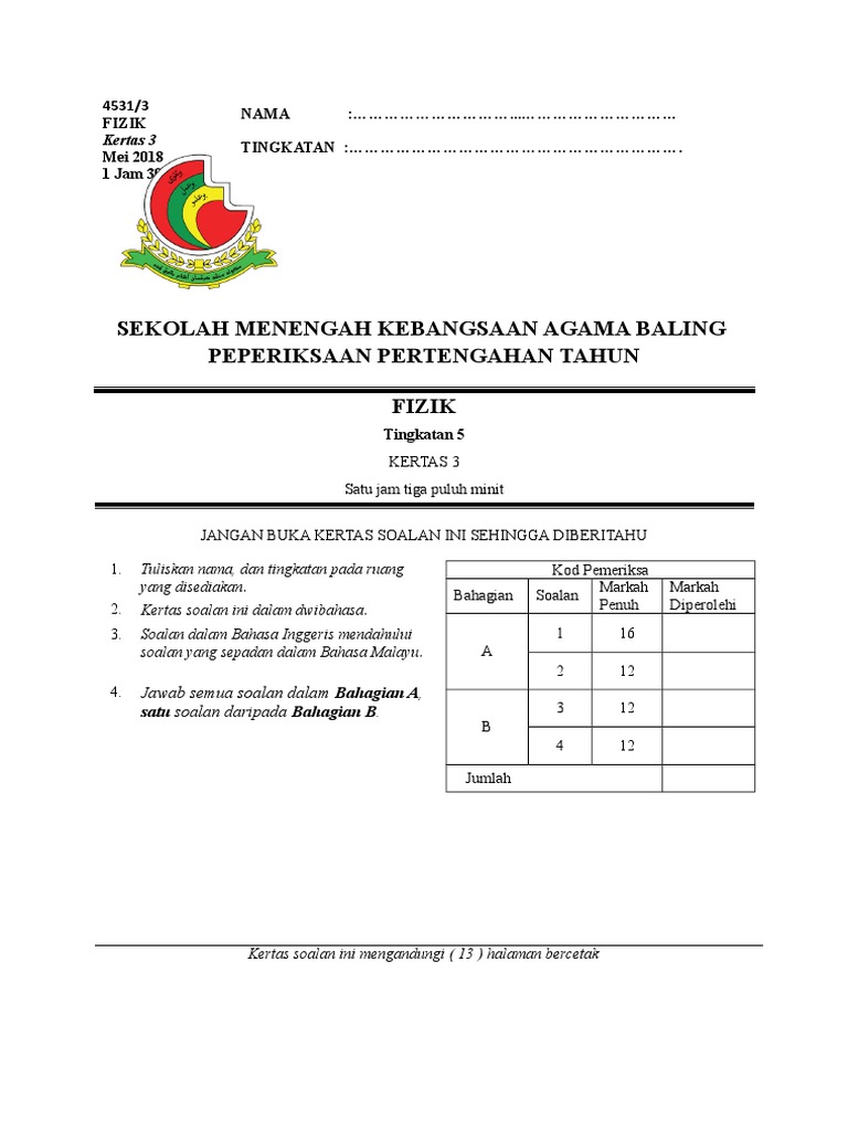 Contoh Soalan Fizik Kertas 3 Tingkatan 4 Z Soalan