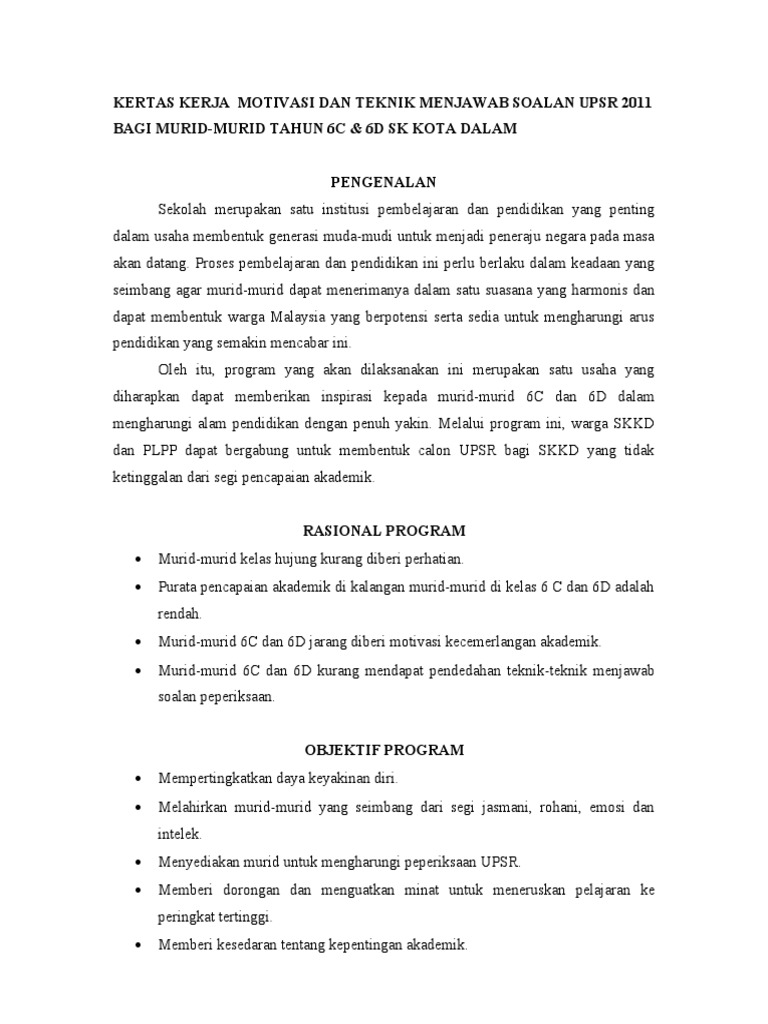 Doc Kertas Kerja Program Motivasi Persediaan Upsr 2015 Ros Mariani Academia Edu