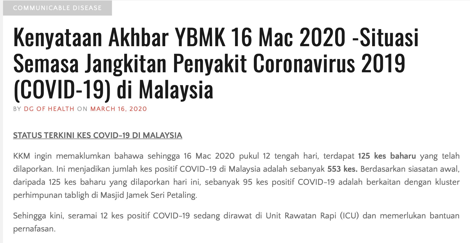 Kenyataan Akhbar Ybmk 17 Mac 2020 Situasi Semasa Jangkitan Penyakit Coronavirus 2019 Covid 19 Di Malaysia From The Desk Of The Director General Of Health Malaysia