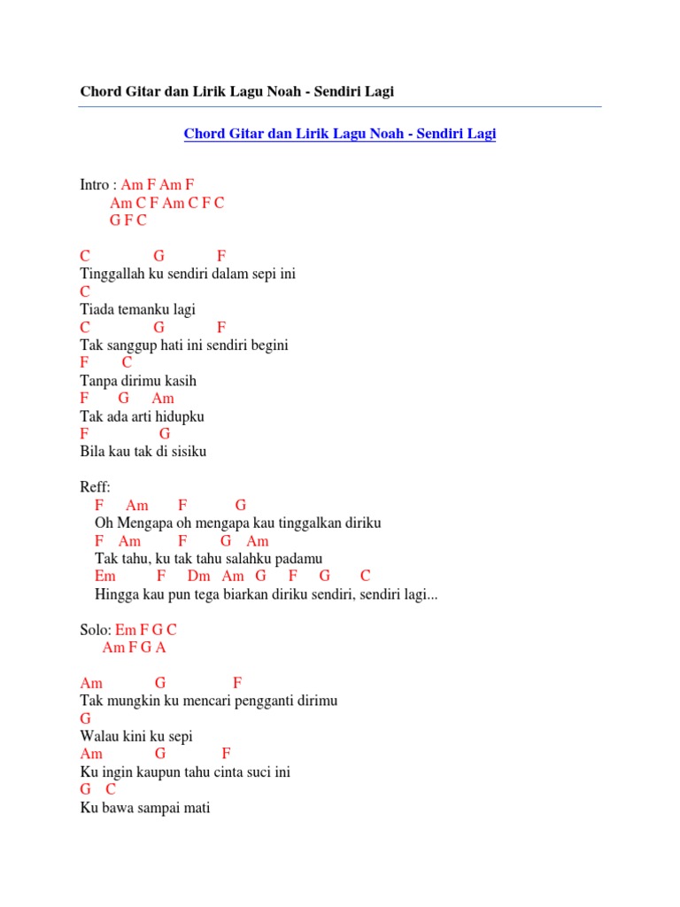 Chord Gitar Dan Lirik Lagu Noah Sendiri Lagi