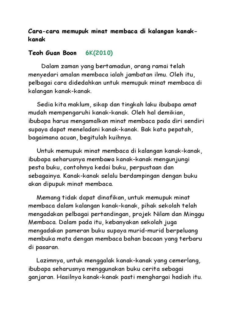 Langkah memupuk amalan membaca. Pihak kerajaan boleh mengadakan kempen yang berkenaan seperti mari membaca malaysia dan bangsa membaca bangsa kerana dapat memupuk amalan membaca. Isi 1 bagi menghuraikan peranan ibu bapa dalam memupuk anak anak ingin saya tegaskan bahawa ibu dan bapa perlu sedar bahawa keputusan untuk mendirikan rumah tangga dan mempunyai zuriat adalah amanah dan tugas yang perlu dilaksana dengan ikhlas. Justerunya pameran buku juga perlu dianjurkan oleh pihak penganjur.