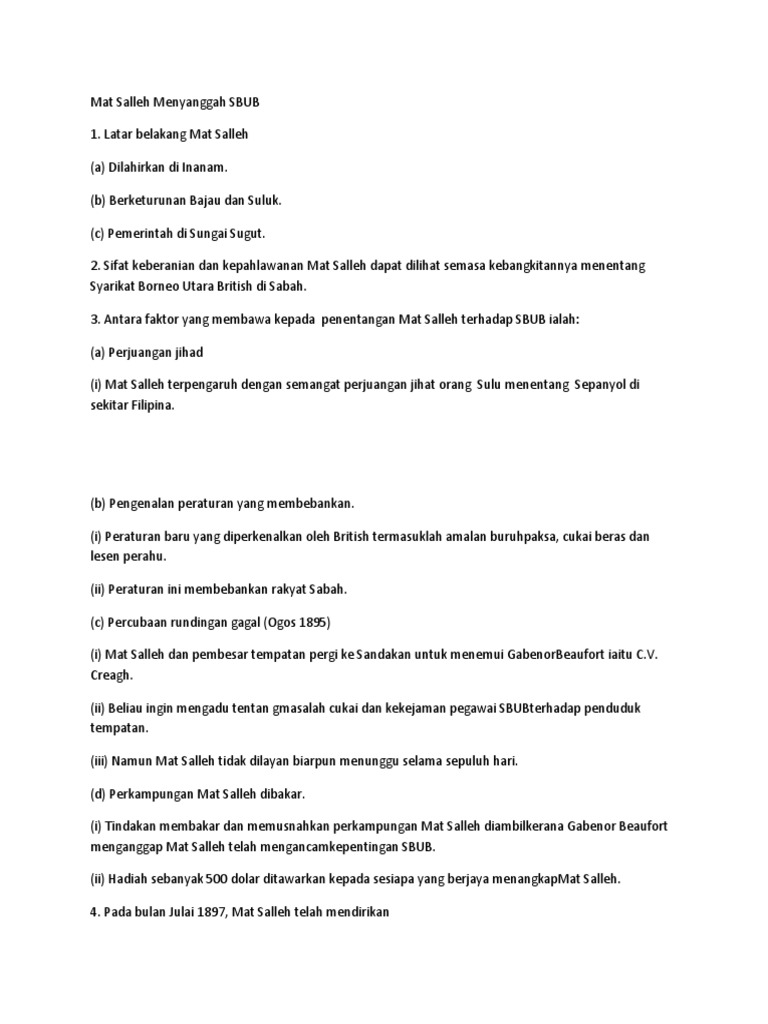 Datu mat salleh lebih dikenali dengan mudah sebagai mat salleh merupakan pejuang sabah yang terkenal dalam penentangan yang hebat terhadap penjajahan british di sabah. Ibunya daripada suku bajau dan ayah datu. 7 8 mat salleh7 8 mat salleh menyanggah sbubmenyanggah sbub a a latarbelakanglatarbelakang b b faktor penentanganfaktor penentangan c c peristiwa penentanganperistiwa penentangan d d kesan perjuangankesan perjuangan.