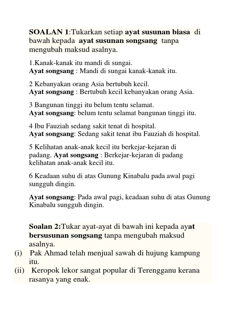 Latihan Tatabahasa Menukar Ayat Bersusunan Biasa Kepada Ayat Bersusunan Songsang Latihan Tatabahasa Menukar Ayat Bersusunan Biasa Kepada Ayat Bersusunan Songsang