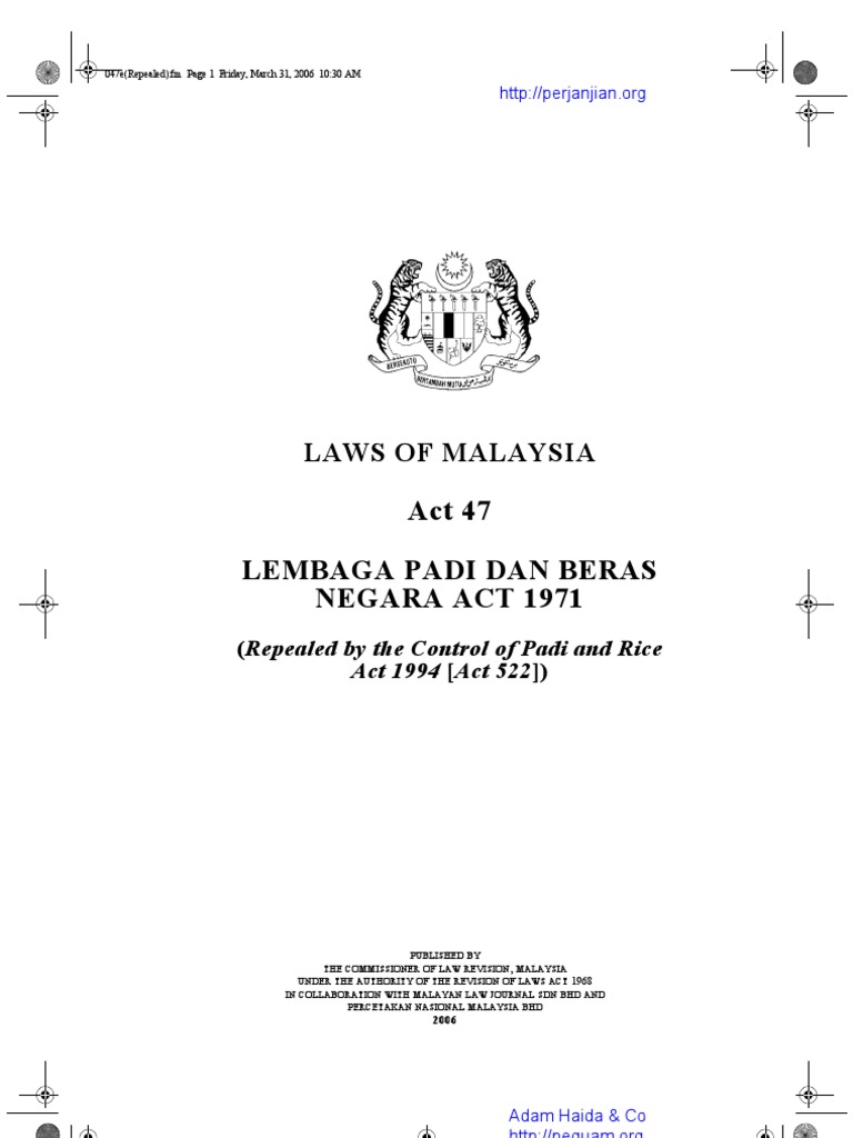 Laws Of Malaysia Lembaga Padi Dan Beras Negara Act 1971 Act 47