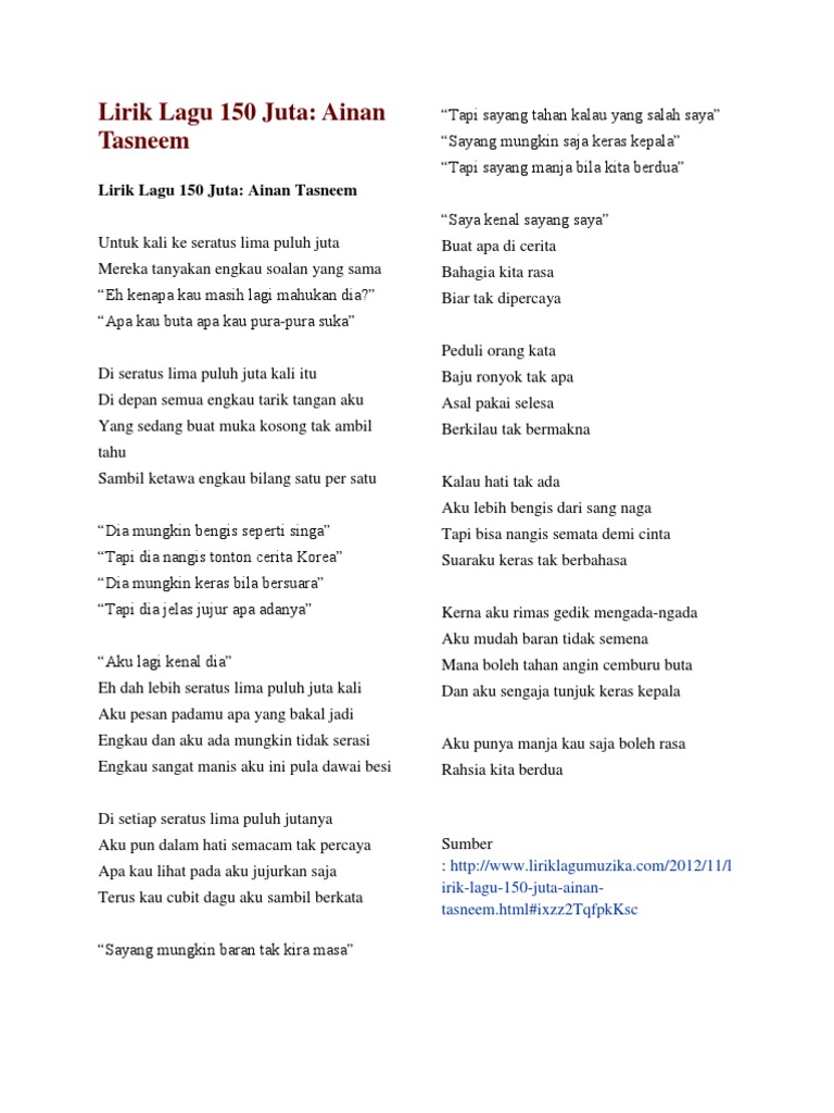Lirik Lirik Lagu Lirik Lagu 150 Juta Ainan Tasneem