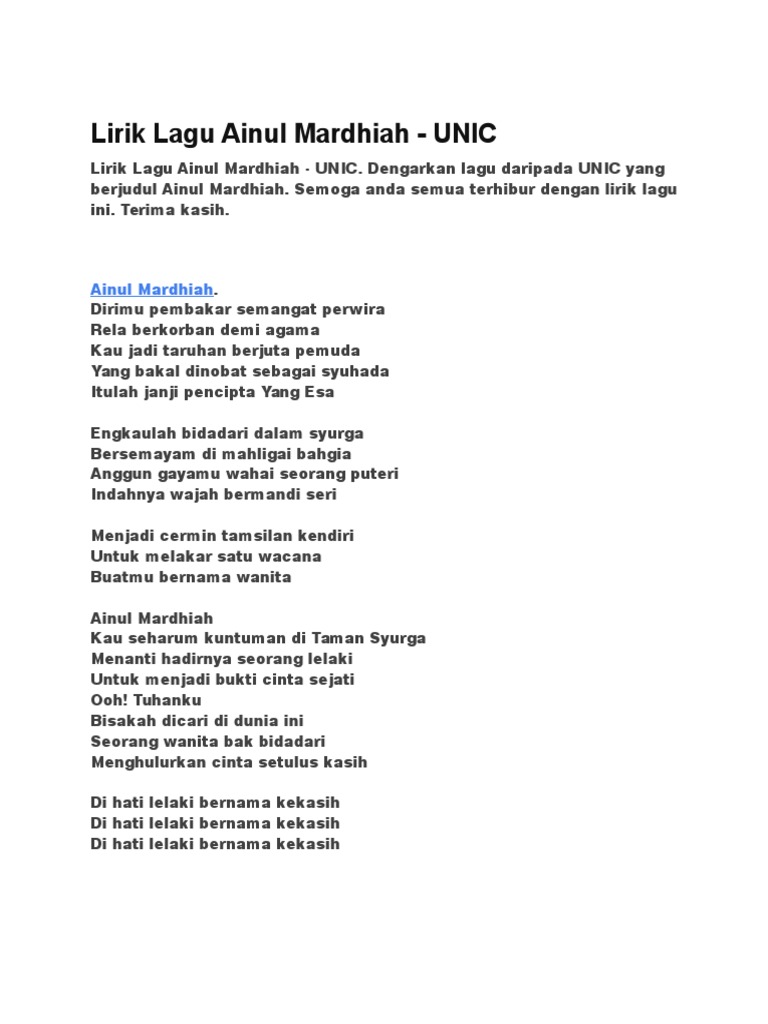 Lirik Lagu Ainul Mardhiah U N I C