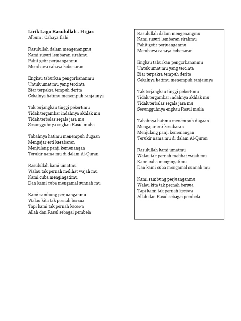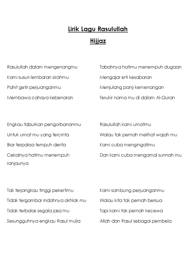Lirik lagu rasulullah hijjaz. Ya rasulullah salam buatmu duhai kekasih allah kami sentiasa mengingatimu wahai penghulu ambia ya rasulullah kini tibalah detik yang bersejarah. Lirik nasyid rasul junjungan hijjaz. Ku pujuk jua hati dan jiwa meluahkan rasa cinta membara didalam pujian ucapan selawat.